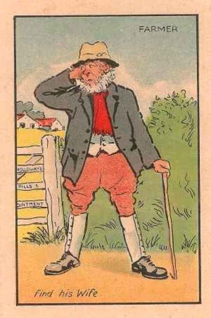 En esta lámina antigua se puede ver a un granjero barbudo con un sombrero y bastón. En el fondo de este reto visual se ve la tranquera que da a su granja.