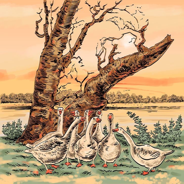 En esta lámina se puede ver a ocho gansos a la orilla de un lago con un árbol mustio de fondo. En este desafío visual con una gran amenaza camuflada para los plumíferos.