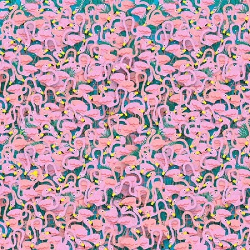 En esta colorida lámina podemos observar cientos de flamencos uno al lado de otro con un fondo de color verde petróleo. En este reto visual se encuentra una bailarina infiltrada.