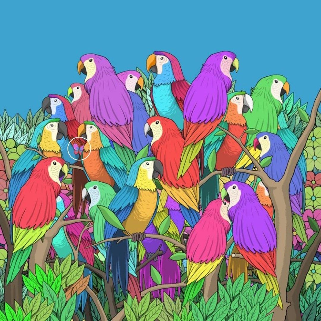 En esta colorida lámina podemos observar muchos loros juntos en una selva. En este reto visual se encuentra un insecto camuflado entre ellos.