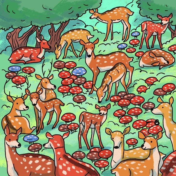 En esta colorida lámina podemos observar decenas de ciervos disfrutando de su ambiente natural. En este reto visual se encuentra un insecto escondido.