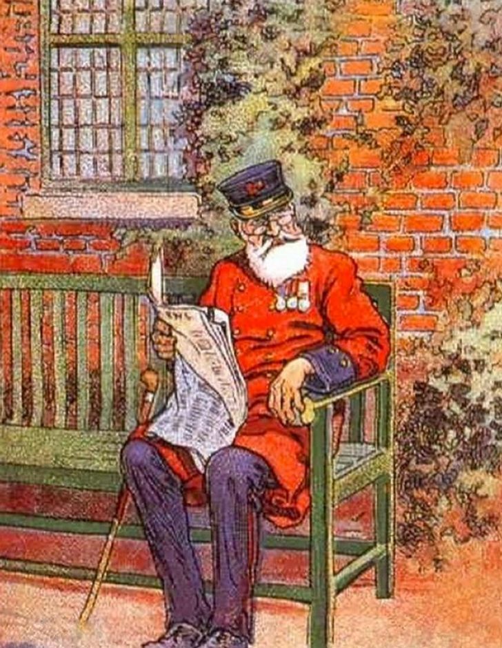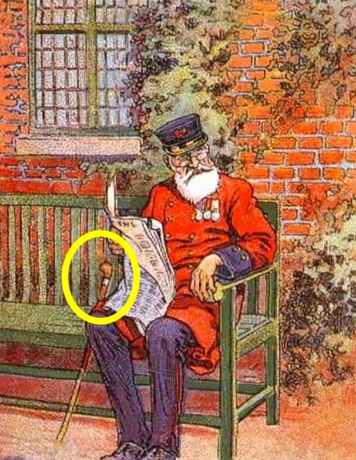 En esta lámina antigua se puede observar un coronel sentado sobre una banca con un periódico en la mano. En este reto visual el longevo hombre no puede encontrar su pipa para fumar la cual se encuentra camuflada.