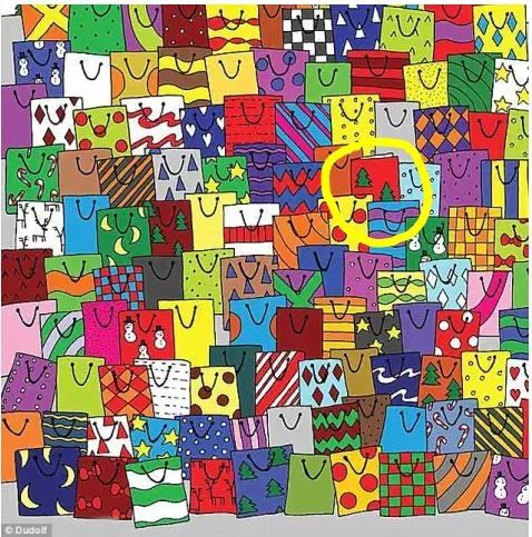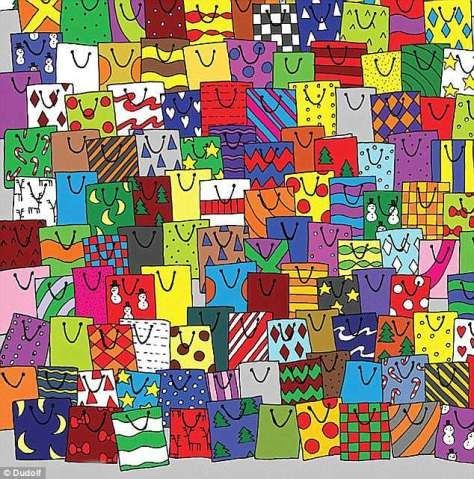 En esta colorida lámina podemos observar un montón de bolsas de regalos una al lado de la otra. En este reto visual se halla una revista escondida.