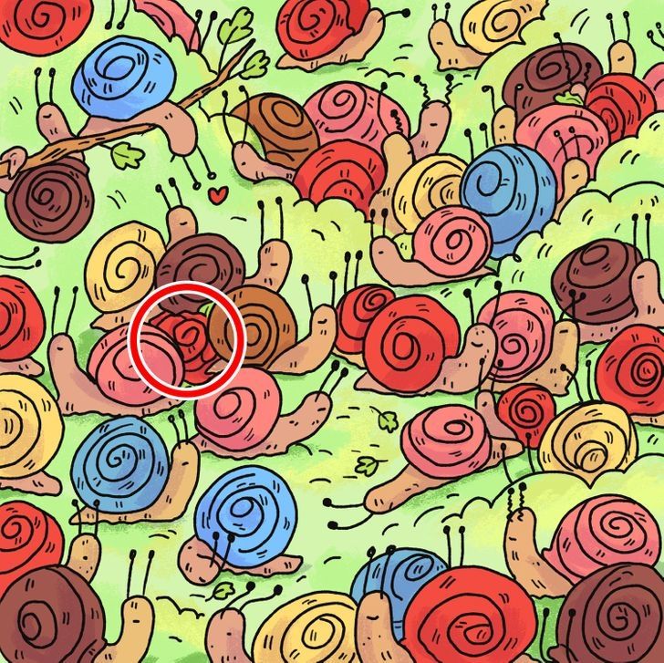 En esta lámina con fondo verde podemos observar decenas de caracoles uno al lado de la otro. En este reto visual se encuentra una flor camuflada entre ellos.