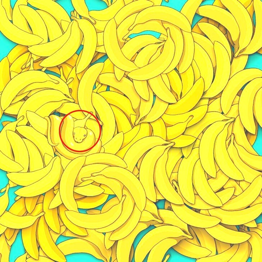 En esta lámina donde predomina el color amarillo podemos observar decenas de bananas uno al lado de otro. En este reto visual se encuentra una serpiente escondida.