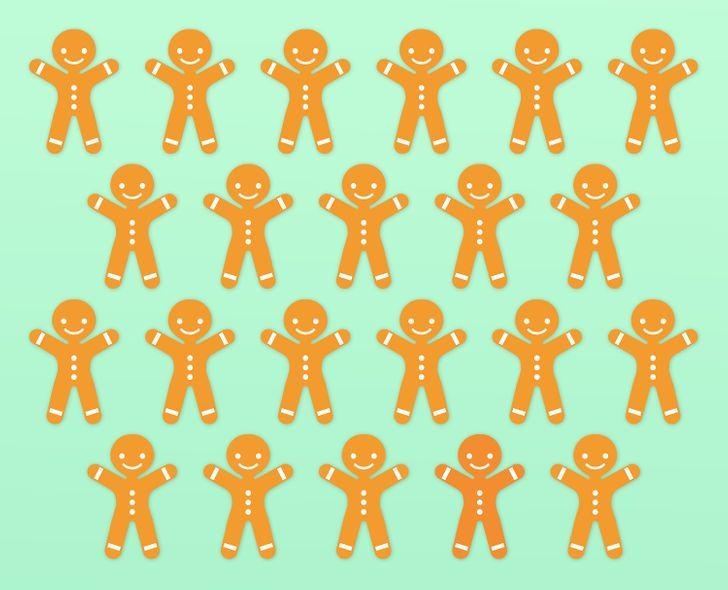 En esta colorida lámina, se puede observar decenas de galletas de jengibres navideñas una al lado de la otra, en un fondo de color celeste. En este nuevo reto visual se encuentra una de ellas con un tono distinto camuflado que es difícil de encontrar en una primera instancia.