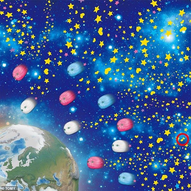 En esta colorida lámina, se puede observar una escena de aterrizaje especial que contiene estrellas, corazones e incluso la tierra, la misma fue creada por el fabricante de juguetes TOMY. En este nuevo reto visual se encuentra una nota camuflada que es difícil de encontrar en una primera instancia.