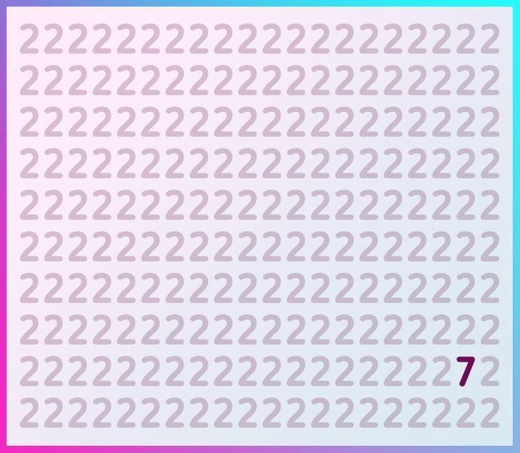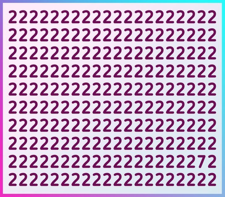 Un nuevo acertijo visual está poniendo a prueba la percepción de miles de personas en internet. Estos retos se han vuelto muy populares en las redes sociales, especialmente desde las restricciones de aislamiento impuestas por la pandemia. El más reciente reto invita a los usuarios a encontrar un número 7 escondido entre varios números 2 de color púrpura oscuro sobre un fondo claro.
