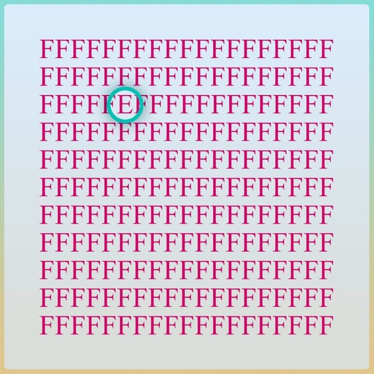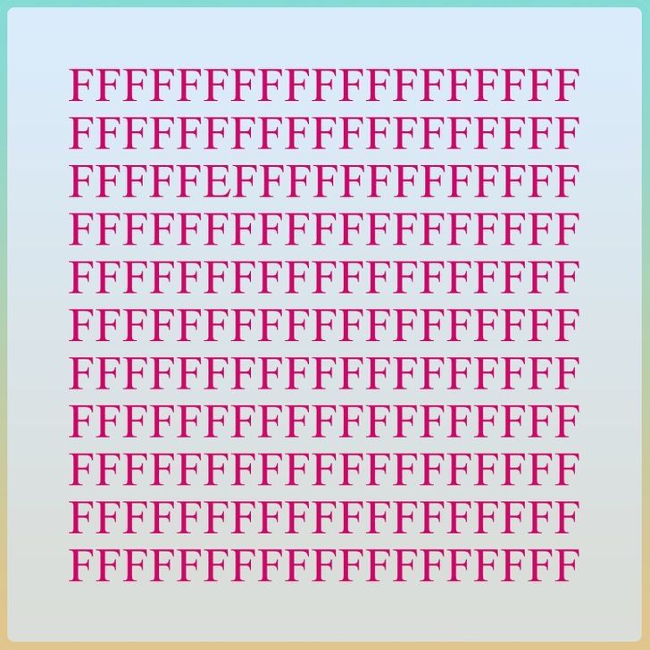 La imagen, diseñada con colores llamativos, muestra una serie de letras F en un tono fucsia sobre un fondo claro. Aunque parece simple a primera vista, el verdadero desafío aparece al intentar detectar la única letra diferente. Este tipo de acertijos no solo es un juego, sino también una manera de estimular el cerebro y entrenar habilidades visuales y cognitivas.