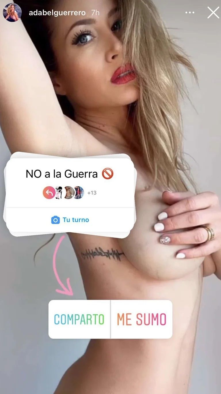 “La bajaron por contenido s*xual. Porque estoy en bolas” indicó Adabel al sitio Teleshow tras sufrir la eliminación de su mencionado contenido compartido en sus historias de Instagram. “No a la guerra” fue la frase que compartió la blonda junto a una votación entre las opciones “Comparto” y “Me sumo”.