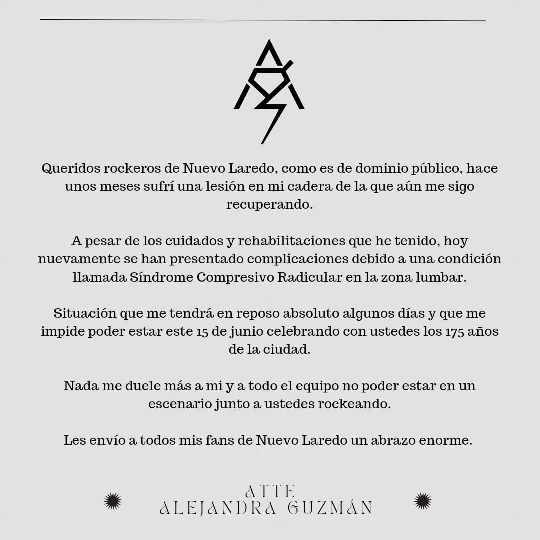En este contexto explicó que ha pasado por diversas rehabilitaciones, pero en la actualidad se han presentado nuevas complicaciones, "una condición llamada Síndrome Compresivo Radicular en la zona lumbar". Por esto, los especialistas le aconsejaron hacer reposo varios días, motivo por el cual se ve imposibilitada a realizar su show en Nuevo Laredo para celebrar los 175 años de la ciudad.