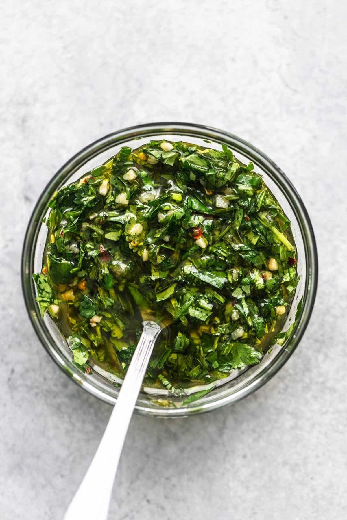 El chimichurri es una de las salsas más utilizadas en Argentina y usualmente se acompaña con carne asada o cocciones hecha a la parrilla. Esta receta es a base de perejil fresco, recuerda utilizar un rico aceite de oliva. Esta salsa podrás utilizarla para hamburguesas, panchos y muchas otras recetas ¡que disfrutes de la preparación!