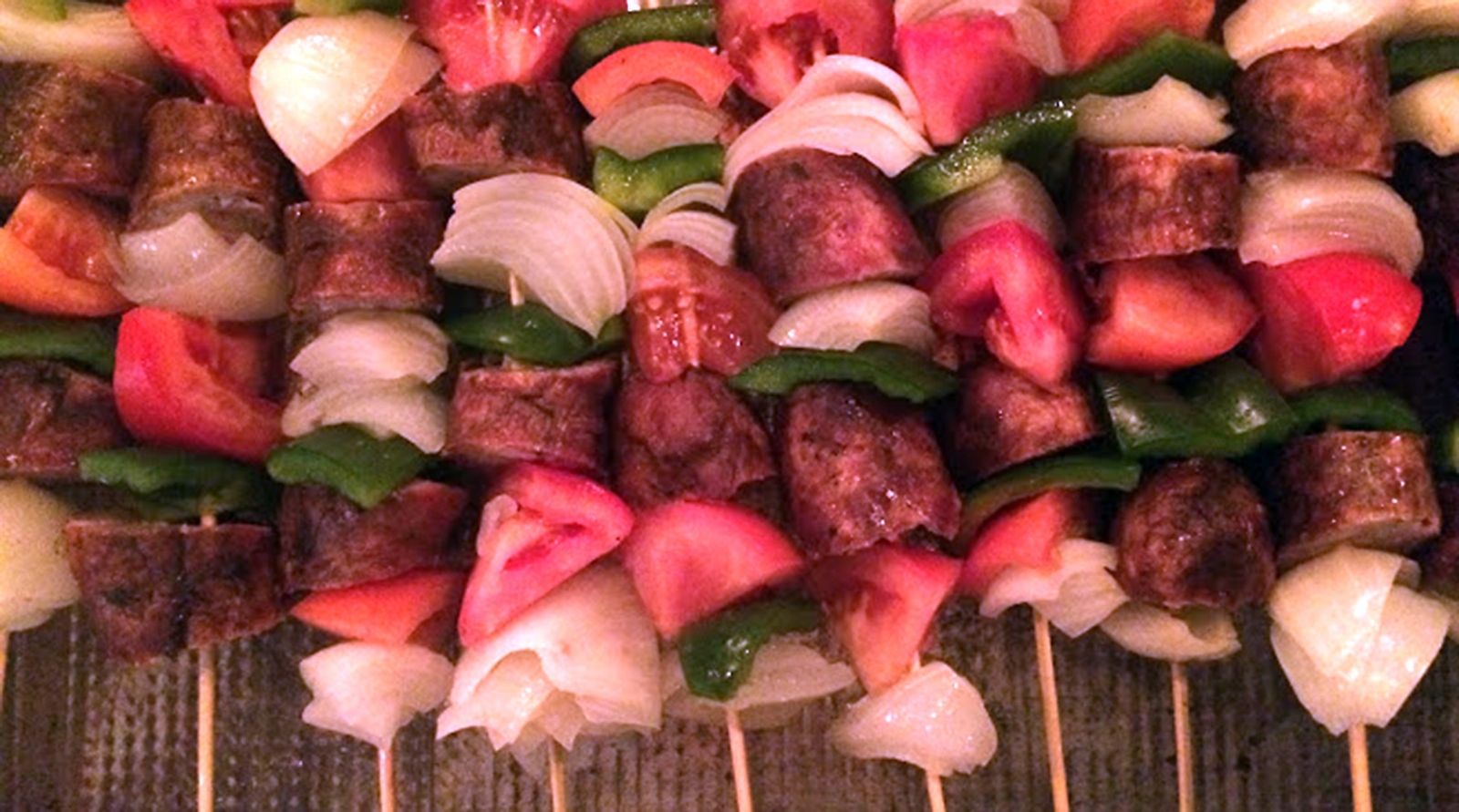 - Armar los brochettes a gusto, tomate, pimiento, cebolla y carne, repetir hasta completar.