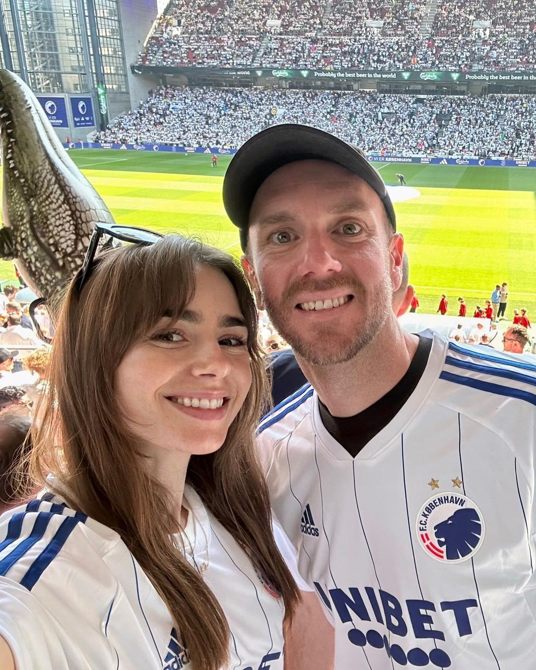 Collins se encargó de publicar un carrete de fotos y videos para mostrar los detalles del encuentro. "¡Alentando a nuestro equipo local F.C. København!...", escribió en el pie del posteo. Al parecer la pareja es fanática del club de fútbol más exitoso y popular de Copenhague, Dinamarca. Por esta razón, Lily y Charlie acudieron a uno de los últimos partidos, vestidos con la camiseta del club.