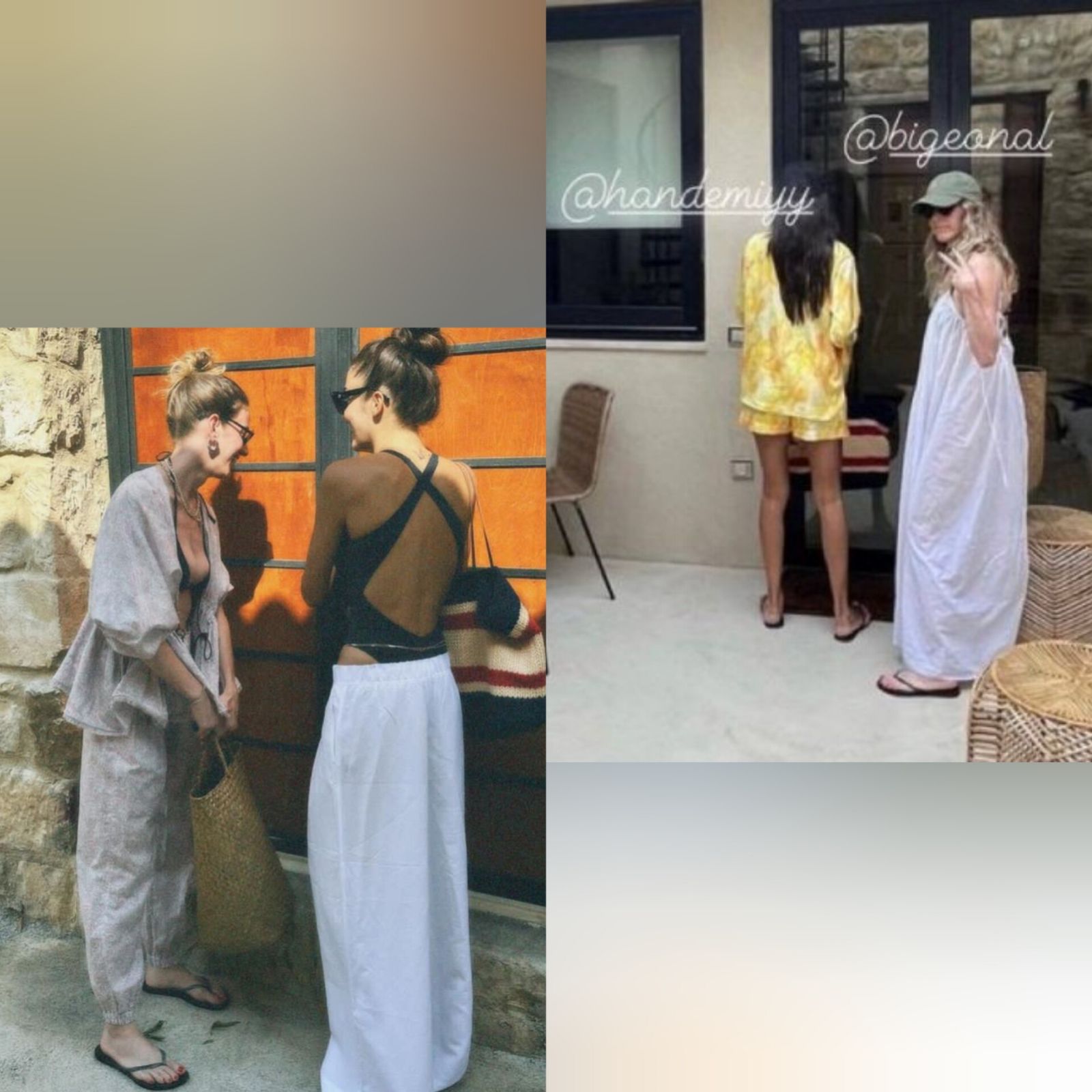 "Posteo de los momentos", reza la descripción qué Bige Önal puso en su último posteo de Instagram en el qué retrató una seguidilla de instantes. En una de las primeras salidas se logra ver a Hande Erçel de espaldas cada una marcando su estilo, por un lado Bige qué lució un conjunto de saco y pantalón holgado con ojotas, llevado al hippie chic y por el otro más ligado al chic veraniego cómo fue el caso de Hande que llevó puesto un maya enteriza de color negra y entrecruzada, pantalón blanco y para terminar el look sumó una tote bag de Saint Laurent.