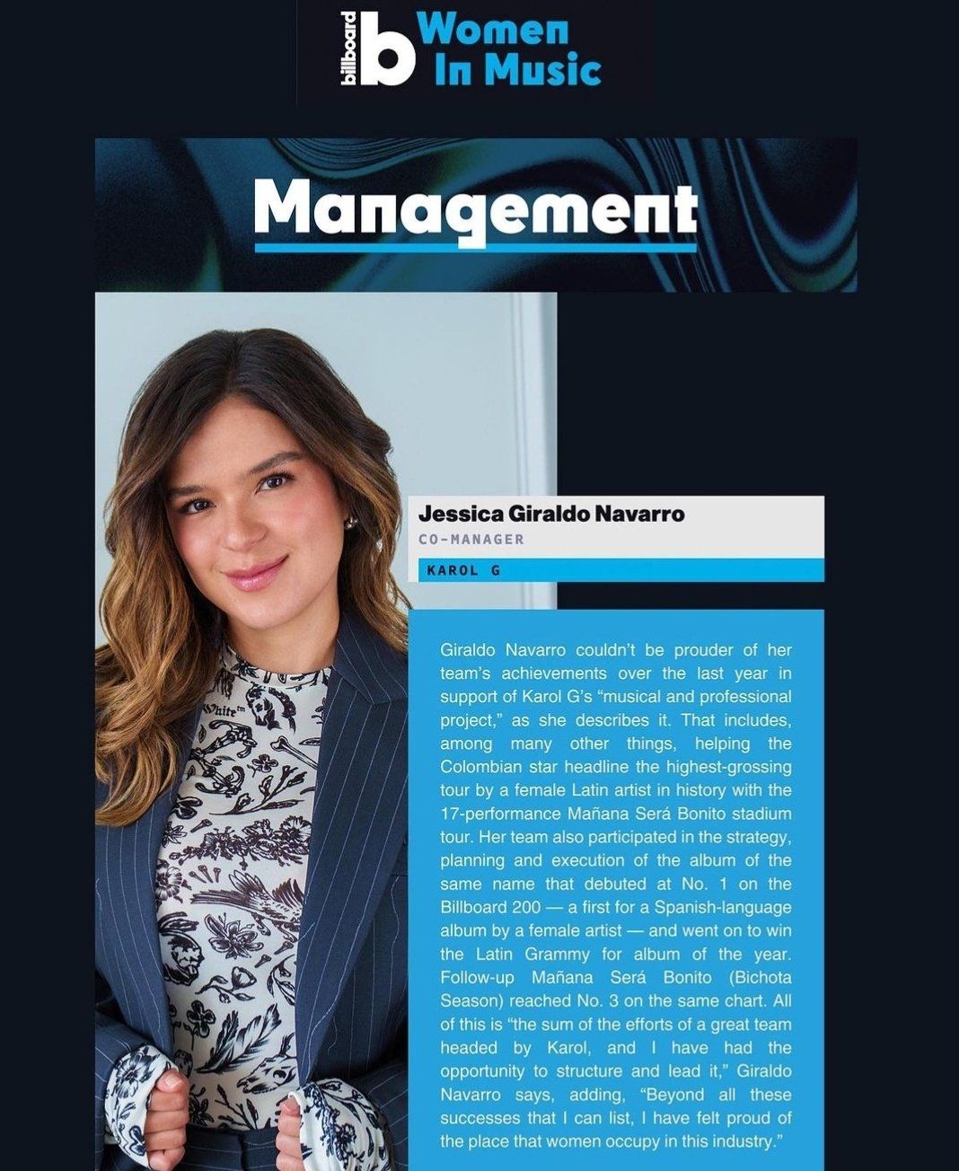 “Hoy @billboard la conmemora como una de las managers del año por el trabajo tan Increíble que hace y lo fuerte que ha sido como mujer cumpliendo su rol y este reconocimiento a su trabajo me trajo una felicidad nueva, increíble porque sé lo duro que trabaja! Mis Papitos con seguridad están muy pero muy orgullosos. Gracias a ella por su compromiso y amor conmigo y al resto del equipo mi equipo de management por tanto! Tengo un equipo soñado!”, concluyó la emotiva dedicatoria de Karol.