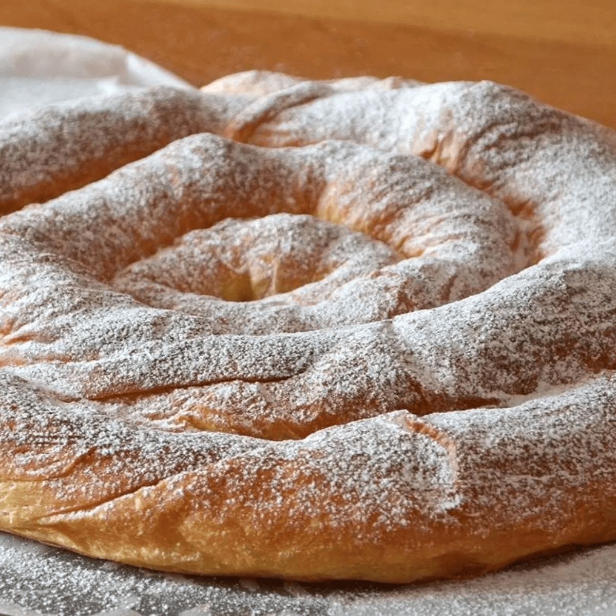 Ahora, toma cada una de las tiras y hazlas caer por su propio peso. Comienza a darle la forma de ensaimada y disponla en la bandeja del horno. Déjala tapada con un film de cocina para que crezca durante 2 horas. Ya listas para llevarlas al horno, a este precaliéntalo a 200 grados con calor arriba y abajo. Hornea durante 12 minutos. Cuando esté lista, déjala sobre una rejilla hasta que se enfríe. Espolvorea un poco de azúcar glass por encima. Y puedes añadirle crema pastelera casera. ¡Y a disfrutar!
