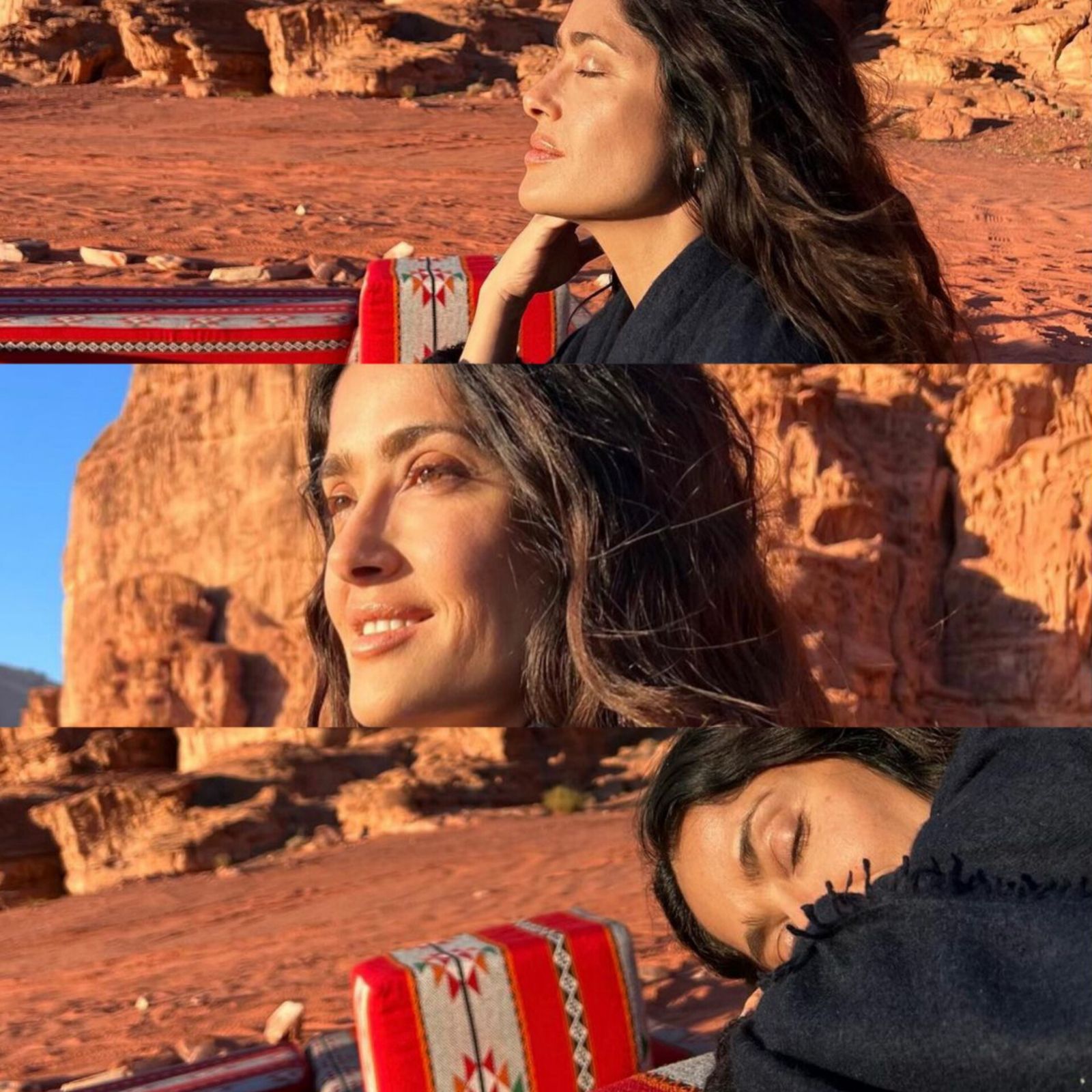 "Inhalando la magia de Jordania, respirando la magia de Jordania", reza en la descripción sobre un carrousel de fotos que le tomó su marido y en las que se la observa a Salma Hayek acostada sobre una mesada rocosa con un mantel regional rojo con detalles circulares, además de una postal en la que aparece Meditando.