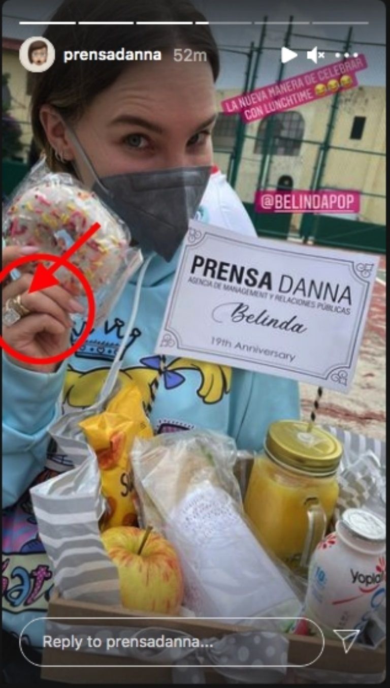 En la imagen difundida en Instagram la artista sostiene en su mano una dona glaseada dejando ver su anillo de compromiso, seguido de otro que parece ser una argolla de matrimonio. Es debido a esto que se presume que Nodal y Belinda concretaron su matrimonio recientemente.