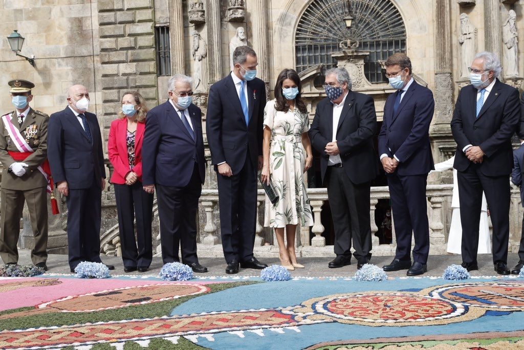 Don Felipe y doña Letizia visitaron la iglesia de San Martiño Pinario, donde fueron recibidos por el alcalde Xose Sánchez Bugallo y el presidente de la Xunta en funciones, Alberto Núñez Feijóo. La visita de la realeza se dio en una importante fecha, la festividad de Santiago Apóstol.