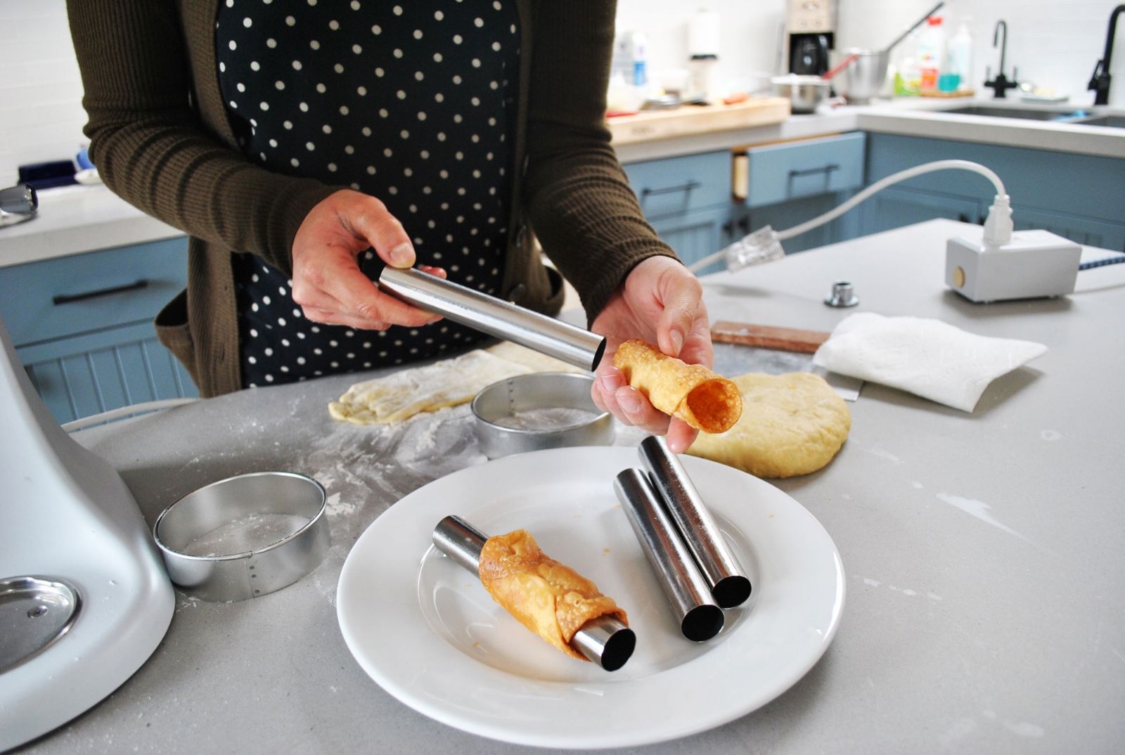 Así cortas y le das forma a la masa para cannoli: Utiliza un cortante circular de 10 centímetros de diámetro, corta discos de masa y reserva sobre la mesa. Reutiliza los recortes para formar más discos. Dispone un disco de masa sobre la mesa, estira desde los lados para formar un óvalo y coloca un tubo de acero de aproximadamente 12cm de largo x 2,5cm de diámetro en el centro de la masa. En caso de no conseguir tubos de acero, se pueden utilizar trozos de caña del mismo tamaño o de madera.