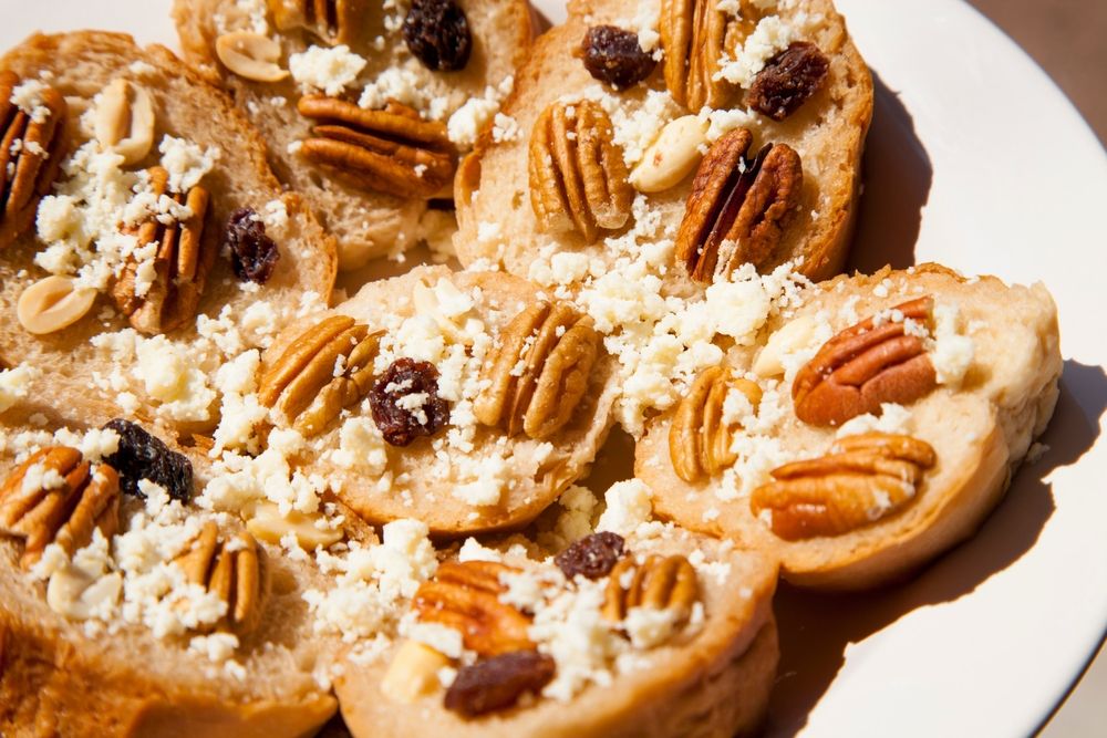 Colocar las rodajas de pan en una fuente de horno con queso cotija rallado, las nueces, las almendras y los cacahuates.