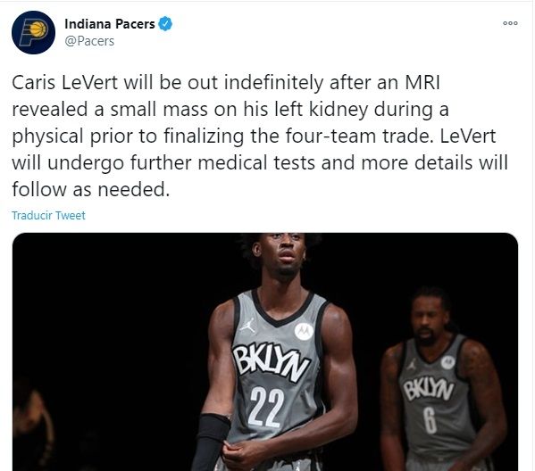 Los Indiana Pacers confirmaron este sábado la baja indefinida del base-escolta Caris LeVert, el jugador que adquirieron de los Brooklyn Nets, en el traspaso del escolta James Harden, después que durante el examen médico obligatorio, una resonancia magnética descubrió que tiene una pequeña masa en el riñón izquierdo.