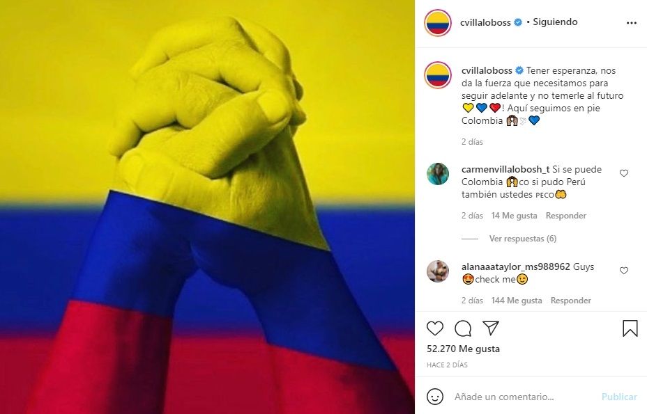 Finalmente, la protagonista de 'Café con aroma de mujer', cerró con un "fuerza Colombia". La publicación se llenó de miles de 'me gusta' y emoticones de corazones y palmas sobreabundaron en los comentarios en señal de apoyo.
