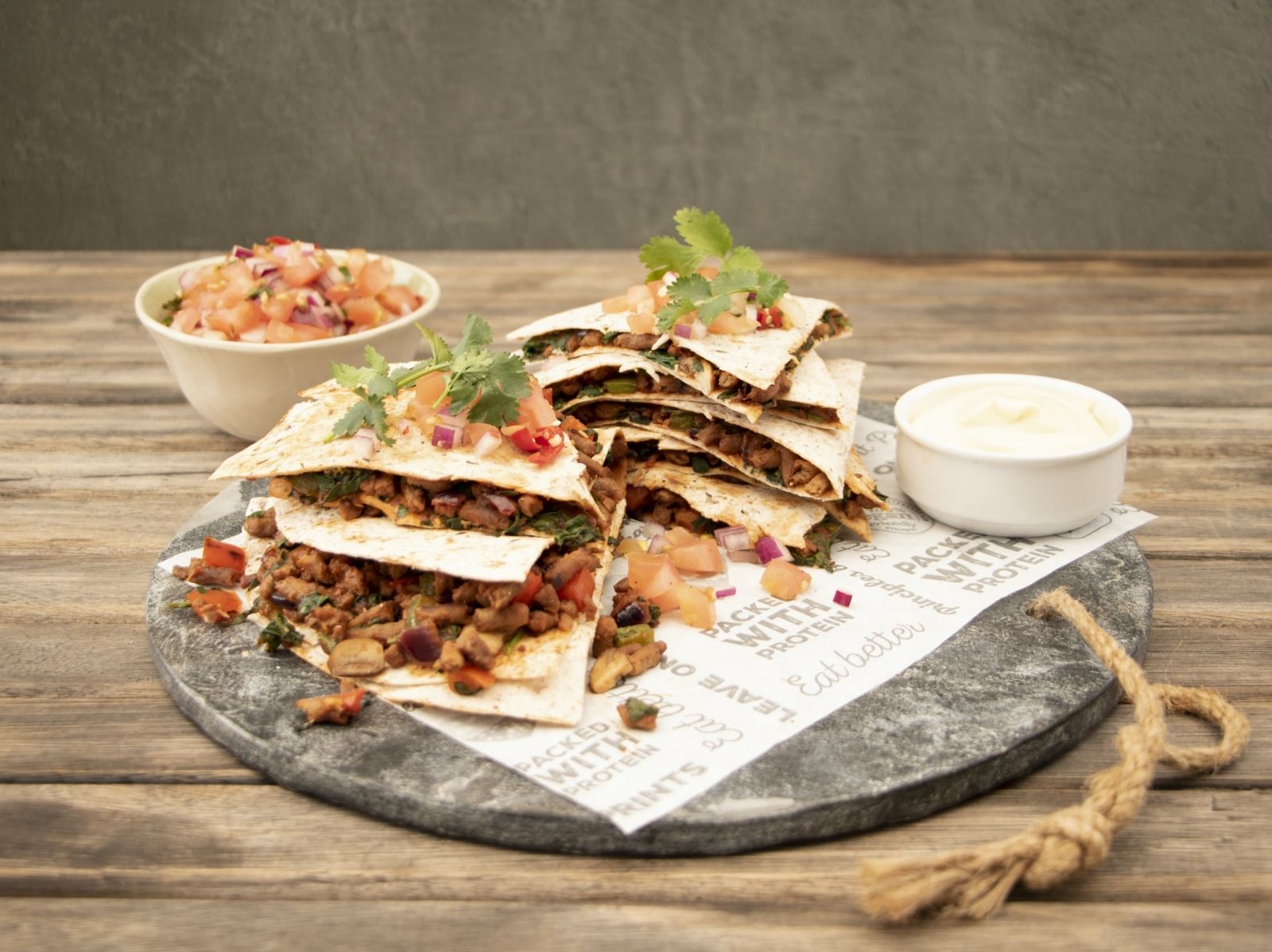 Dividimos mentalmente la tortilla en 4 partes y colocamos en ¼ el pollo, en el otro el guacamole, en la tercera parte la rúcula y por último el queso en hebras. Doblamos uniendo desde el corte hacia arriba, juntando dos caras por vez hasta cerrarlo tipo pañuelo.
