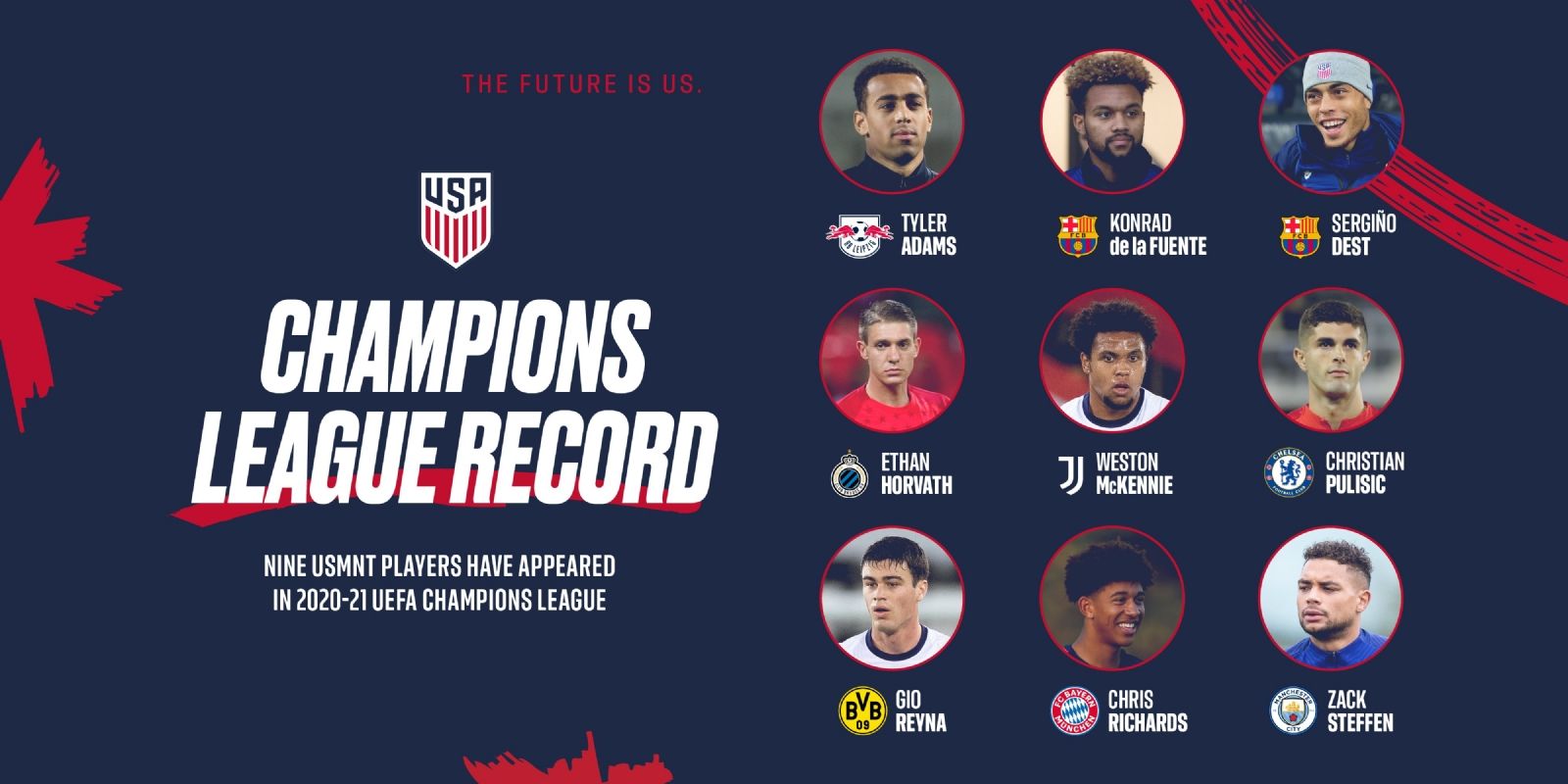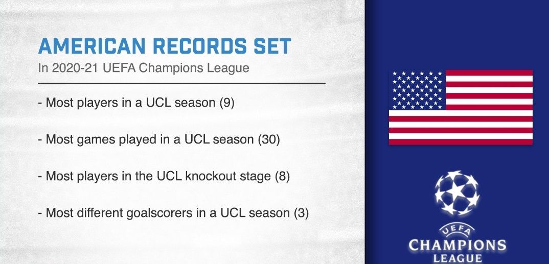 Entre todos disputaron treinta partidos y, de ellos, ocho avanzaron a los octavos de final con sus respectivos equipos: Konrad de la Fuente, Sergiño Dest (Barcelona), Weston McKennie (Juventus), Christian Pulisic Chelsea), Giovanni Reyna Dortmund), Chris Richards (Bayern), Tyler Adams (Leipzig) y el citado Steffen. Ethan Horvath, arquero del Brujas de Bélgica quedó eliminado de esta competición pero jugará la Europa League por finalizar en el tercer lugar.