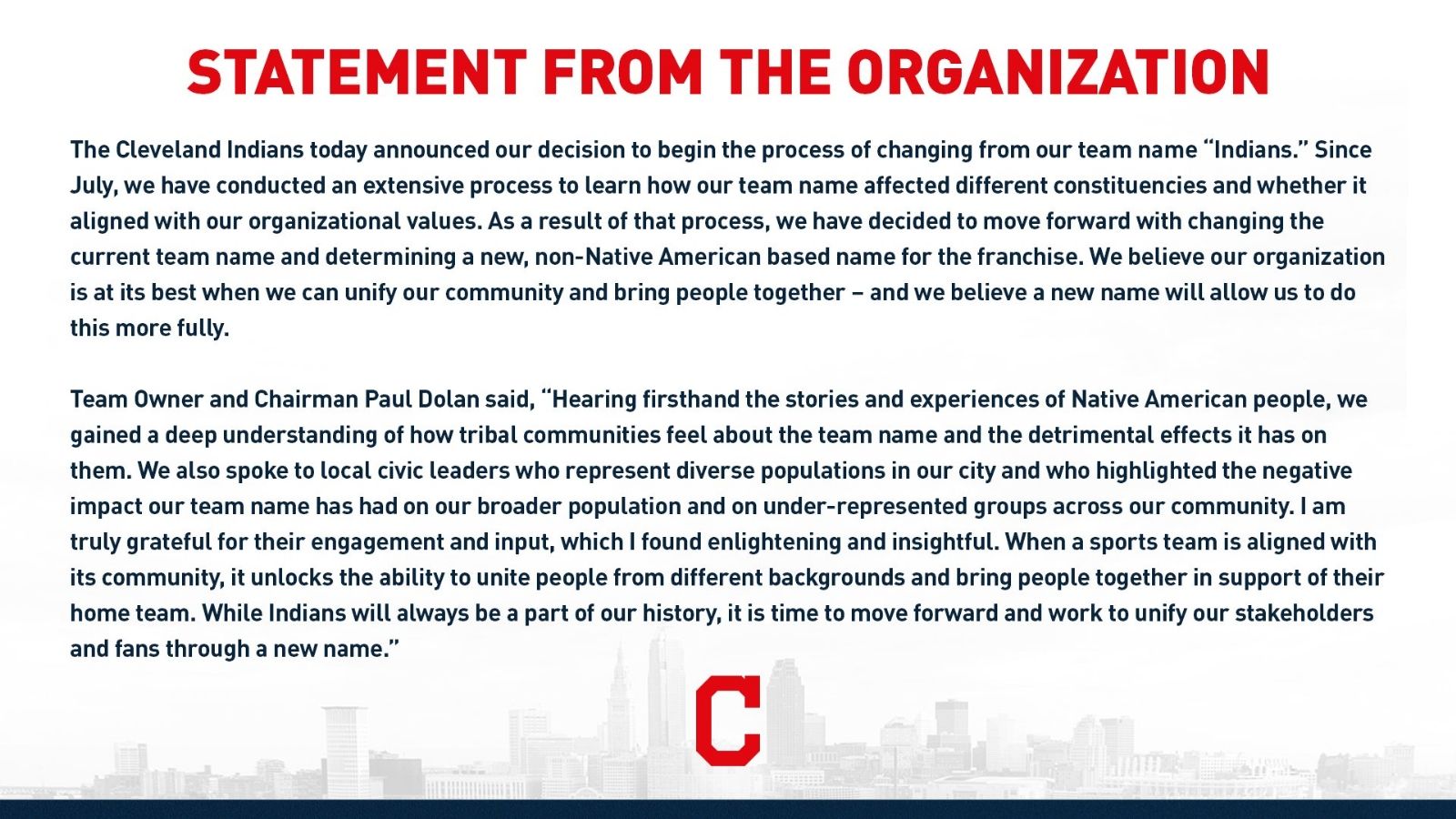 Por medio de una carta firmada por el propietario de la franquicia de Ohio, Paul Dolan, informaron que"Los Indios de Cleveland anunciaron hoy la decisión de comenzar el proceso de nuestro cambio de nombre de "Indios". Desde julio, hemos realizado un extenso proceso para aprender cómo nuestro nombre de equipo afecta diferentes circunscripciones y si se alinean con los valores de nuestra organización".