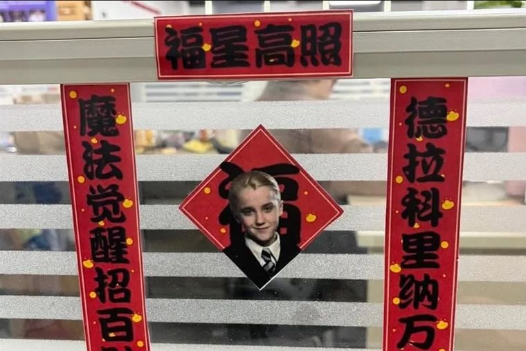 En China, el Año Nuevo Lunar mueve rituales, regalos y decoraciones rojas. En ese contexto, la imagen de Malfoy comenzó a circular como símbolo de buena suerte. Posters con su rostro sonriente aparecieron en puertas, heladeras y escritorios, tal como se hace con figuras tradicionales.