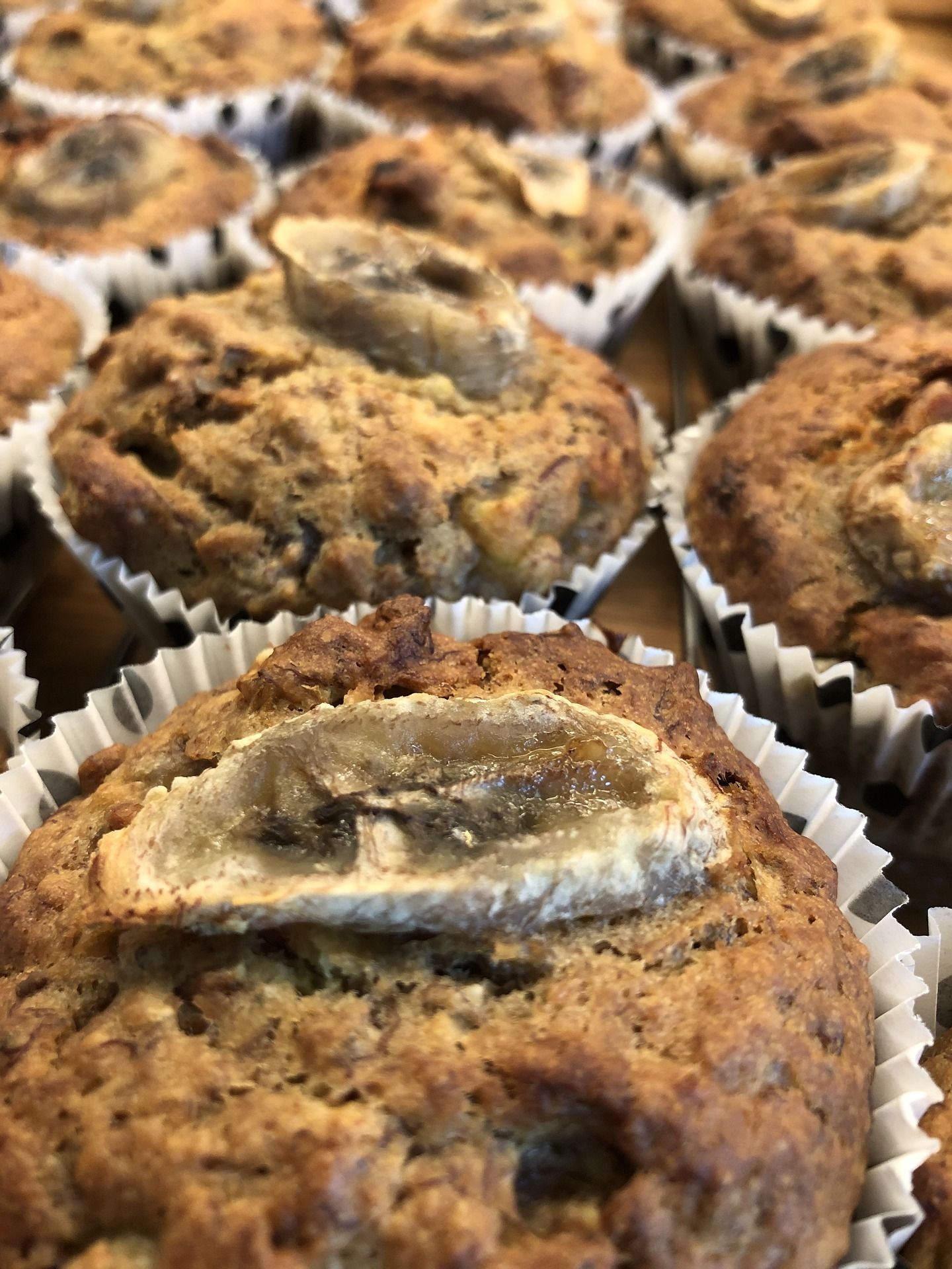 Hoy utilizaremos harina integral, contiene más fibra, en consecuencia colabora el trabajo de nuestros intestinos. Si tienes los plátanos con la piel oscura o negra ¡son ideales para esta receta, porque son más dulces! Recuerda precalentar el horno, preparar los moldes con un poco de materia grasa (si tienes un rociador aún mejor) ¡Y listo!
