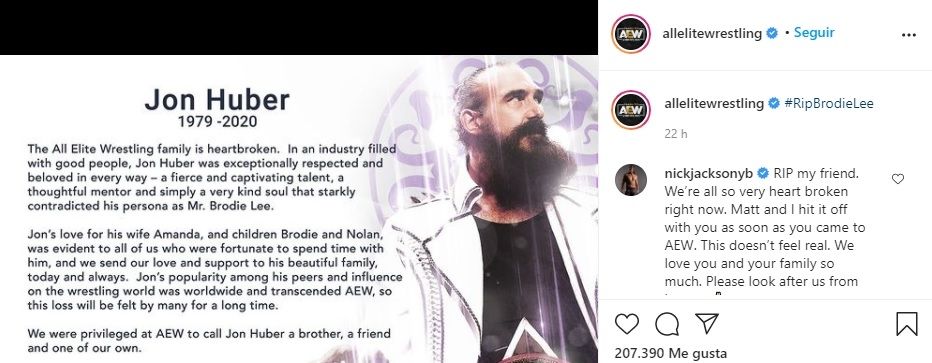 "La familia de All Elite Wrestling está con el corazón roto. En una industria llena de gente buena, Jon Huber era excepcionalmente respetado y amado en cada forma. La popularidad de Jon entre sus colegas y su influencia en el mundo de la lucha libre profesional era global y trascendió AEW, así que esta pérdida será sentida por muchos por un largo tiempo", escribieron.