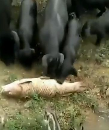 En esta ocasión, los protagonistas del clip son un grupo de cerditos que intentan ayudar a un pez que se encontraba afuera de su hábitat. En las imágenes se ve a los lechones de color negro haciendo lo imposible para que su amigo acuático pueda volver al agua.