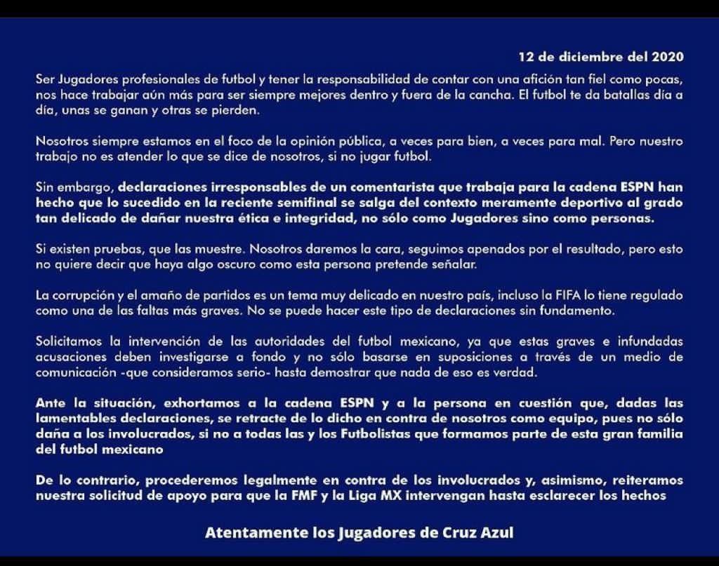 En el mismo comienzan resaltando su profesionalismo, condenan las declaraciones emitidas por Huerta y piden a ESPN que presente pruebas por los dichos. "Si existen pruebas, que las muestre, nosotros daremos la cara, seguimos apenados por el resultado, pero esto no quiere decir que haya algo oscuro como esta persona pretende señalar", escribieron.