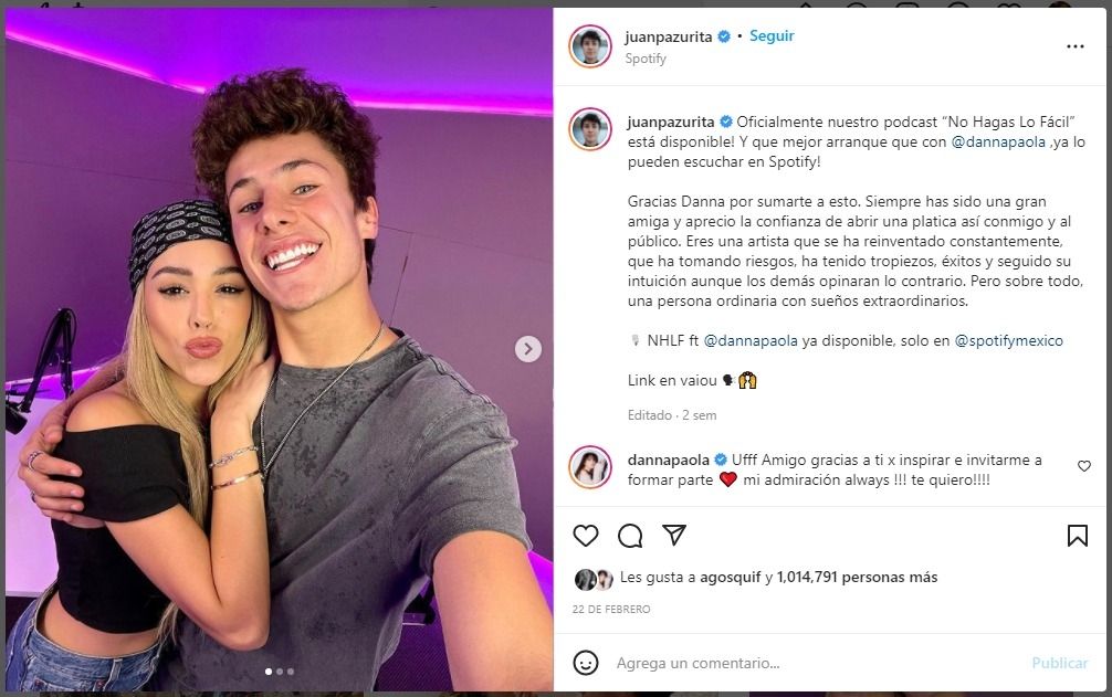En esta ocasión, el también actor y creador de contenido mexicano, Juanpa Zurita lanzó un nuevo podcast titulado No Hagas Lo Fácil. Para su estreno el 22 de febrero pasado, invitó nada más ni nada menos que a Danna Paola a ser parte.