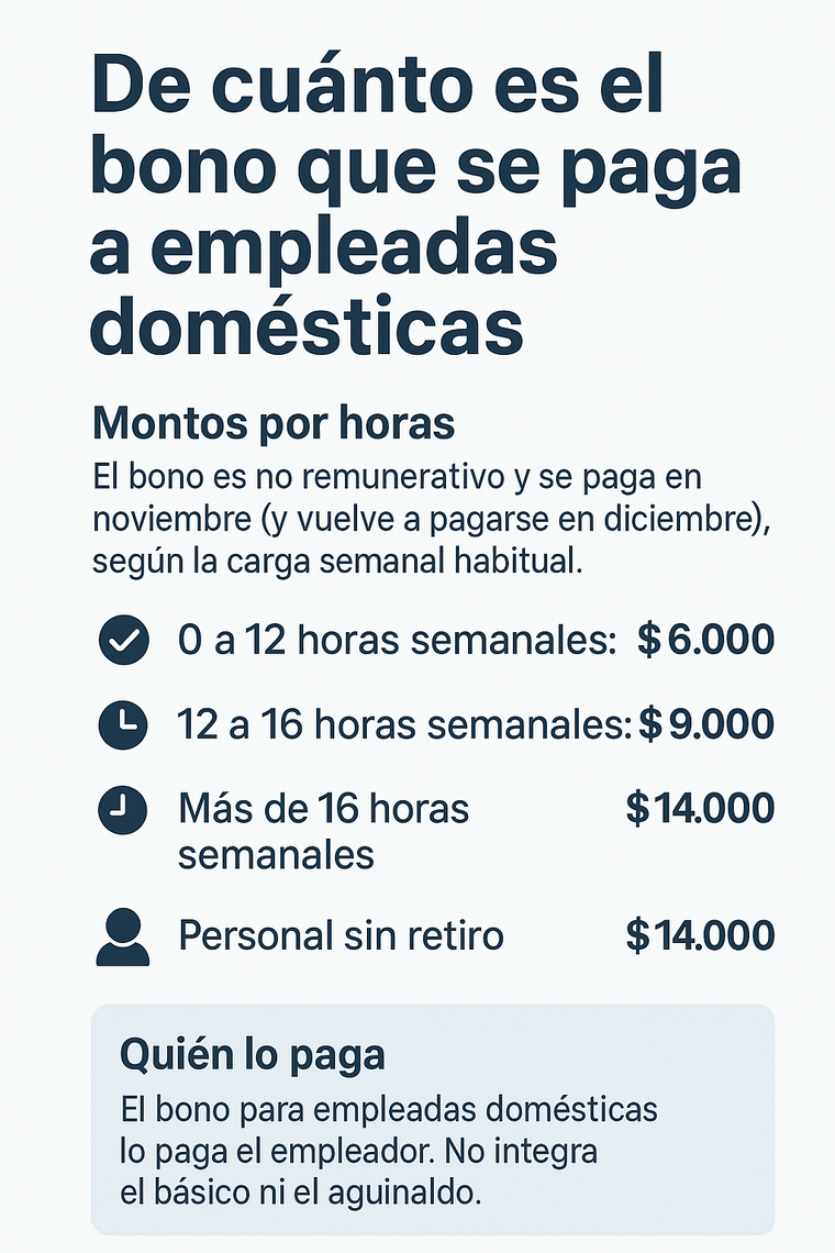 El bono para empleadas domésticas lo paga el empleador y se paga con la liquidación de noviembre y otra vez en diciembre. Es un monto fijo según el tramo de horas semanales. Al ser no remunerativo, no integra el básico ni impacta en aguinaldo, vacaciones u horas extra.
