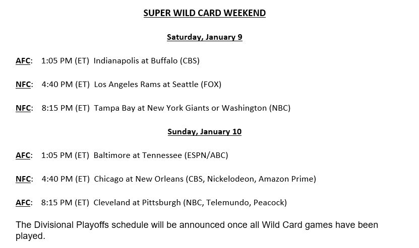 La acción de la postemporada de la NFL comenzará el sábado 9 de enero con el juego entre Indianapolis Colts y Buffalo Bills por el primer duelo de comodín de la Conferencia Americana (AFC). En segundo turno, por la Conferencia Nacional (NFC), se enfrentarán Los Angeles Rams y Seattle Seahawks.