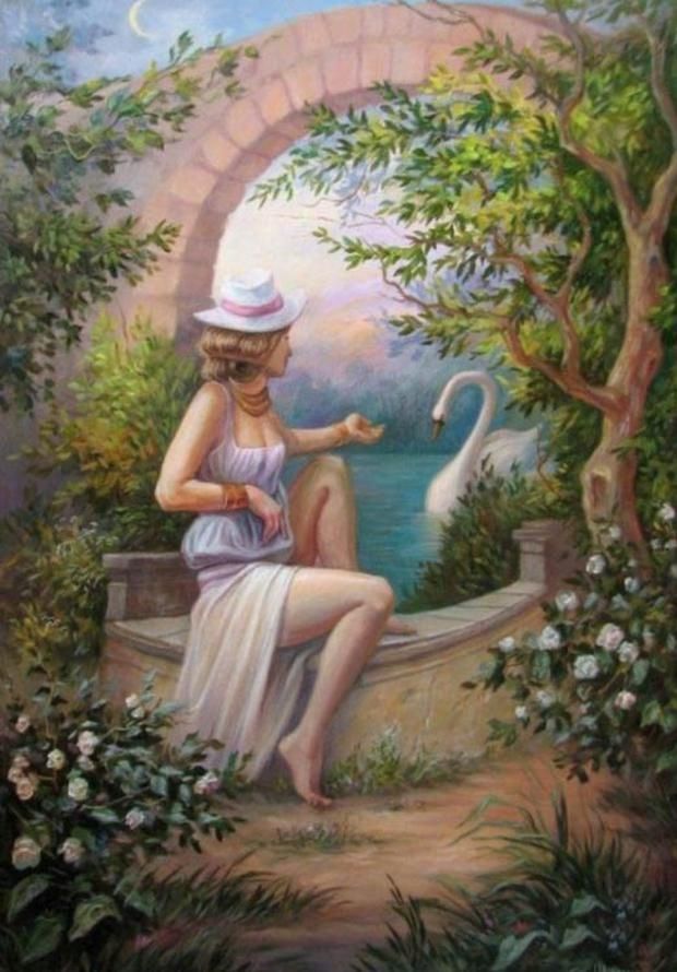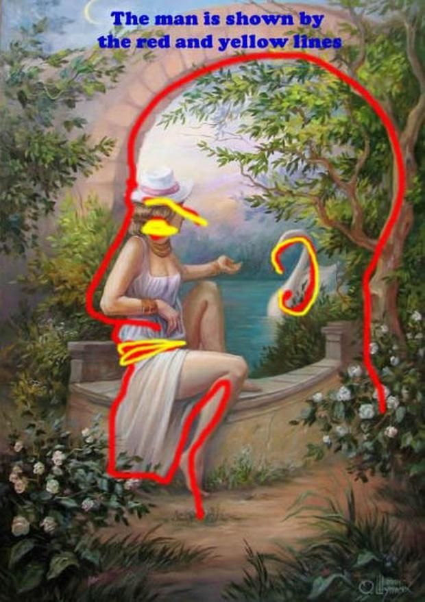 En este simple y colorido dibujo, se puede observar una bella joven sentada contemplando el andar de un cisne blanco en un lago. En este nuevo reto visual se encuentra una figura camuflada, la cual es difícil de encontrar en una primera instancia.