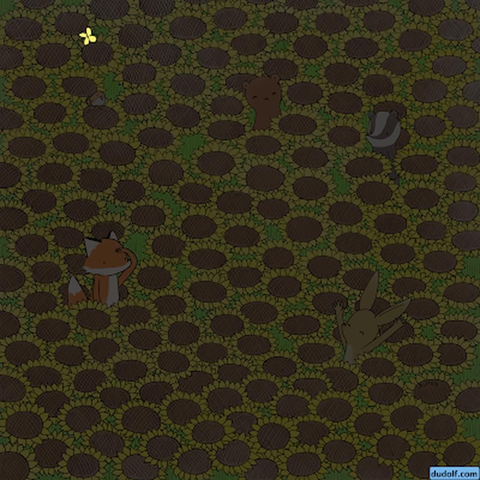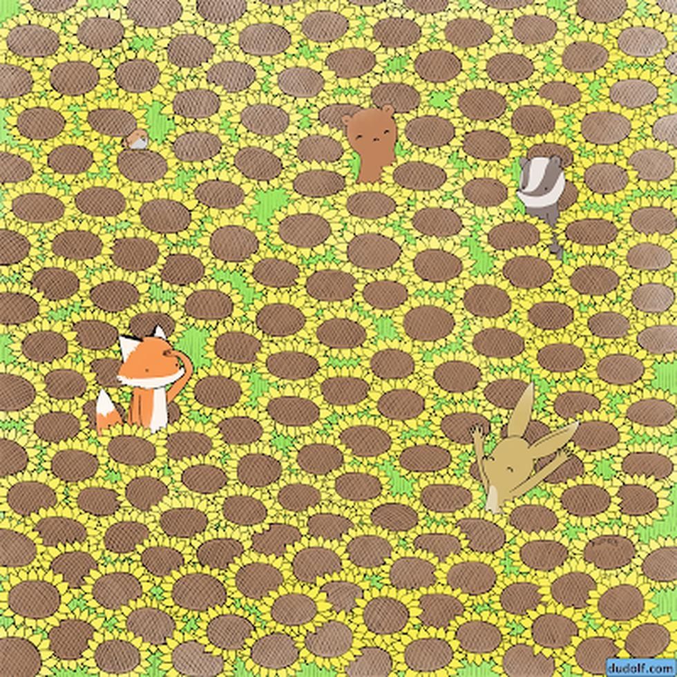 En este simple y colorido dibujo, se puede observar decenas de girasoles uno al lado del otro sobre un fondo verde y con varios animales en el medio. En este nuevo reto visual se encuentra un insecto infiltrado, el cual es difícil de encontrar en una primera instancia.