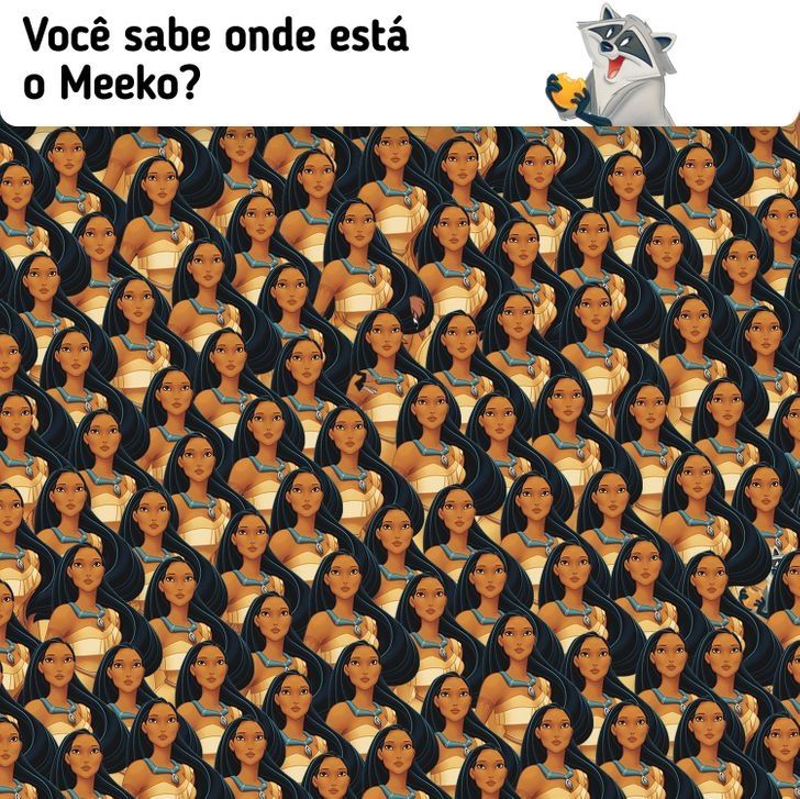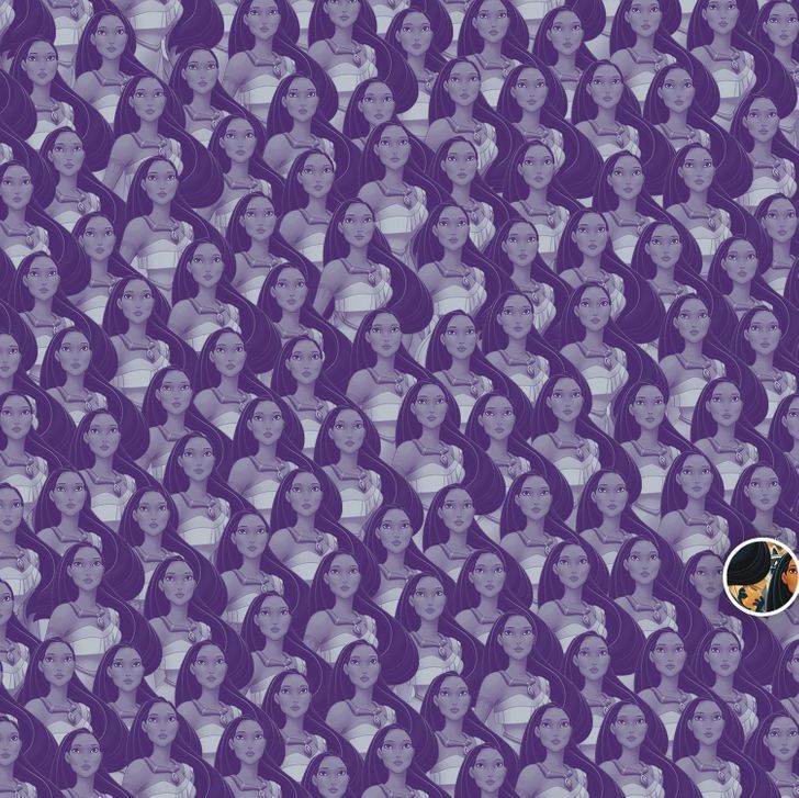 En este simple y colorido dibujo, se puede observar decenas de Pocahontas, uno al lado del otro. En este nuevo reto visual se encuentra un personaje infiltrado, el cual es difícil de encontrar en una primera instancia.