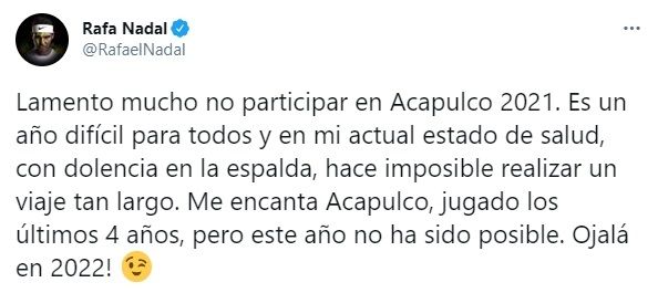 "Lamento mucho no participar en Acapulco 2021. Es un año difícil para todos y en mi actual estado de salud, con dolencia en la espalda, hace imposible realizar un viaje tan largo. Me encanta Acapulco, donde he jugado los últimos 4 años, pero este año no ha sido posible. ¡Ojalá en 2022!", publicó Nadal en su cuenta de Twitter.