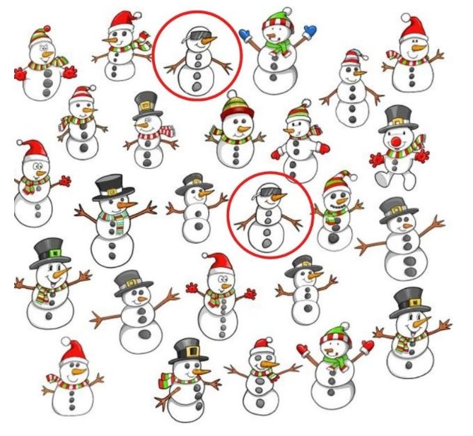 En el reto visual del día, hay una lámina de fondo blanco viene repleta de muñecos de nieve. Cada uno de estos muñequitos blancos presentan gorros navideños de distintos colores y formas. No obstante, hay dos muñecos idénticos que se han escondido entre el resto y la misión de los lectores es encontrarlos.