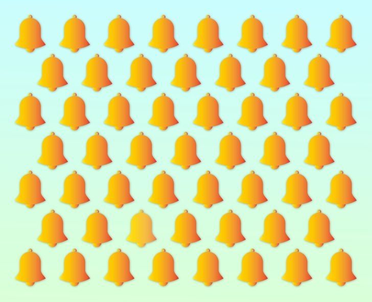 En la ilustración presentada, se pueden ver numerosas campanas doradas dispuestas sobre un fondo celeste. El reto consiste en identificar una campana que tiene un tono ligeramente diferente, lo cual no es fácil de detectar a simple vista. El objetivo de este desafío es que los usuarios encuentren la campana de color distinto en la imagen.