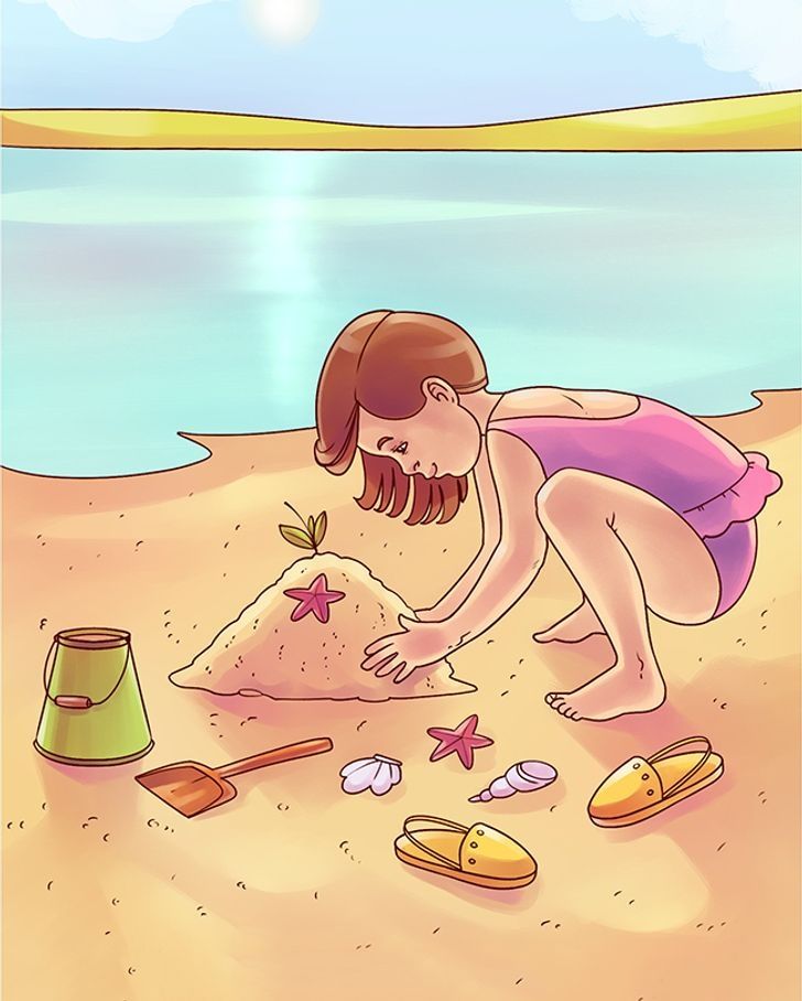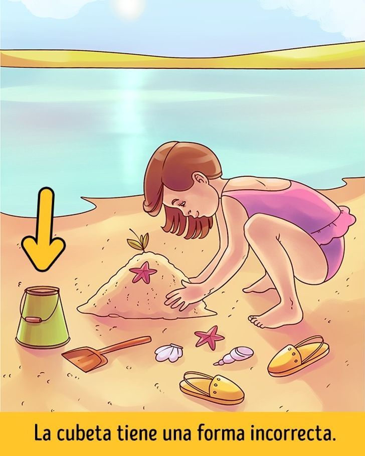 En esta mencionada lámina se puede observar una caricatura de una niña realizando un castillo de arena en la playa con el mar de fondo. En este nuevo reto visual posee una anomalía que es difícil de encontrar en una primera instancia.