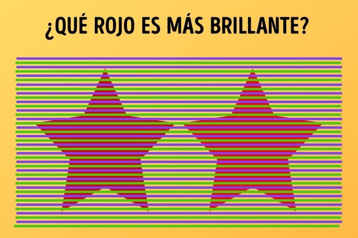 En esta ocasión, deberán observar detenidamente la imagen en la que se pueden ver dos estrellas de color rojo detrás de una serie de líneas violetas y verdes sobre un fondo amarillo. El reto, para quienes se animen, es determinar cuál de los colores de las dos figuras es más brillante. El desafío visual puede parecer sencillo a simple vista, pero lo cierto es que no lo es.