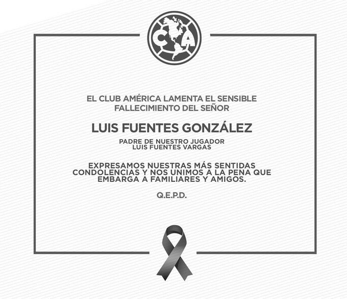 "El Club América lamenta el sensible fallecimiento de Luis Fuentes González, padre de nuestro jugador Luis Fuentes Vargas Q.E.P.D.", anunció el club capitalino. A media semana, el club también envió condolencias al defensor Jordan Silva, por la muerte de su hermano; ayer se guardó un minuto de silencio en el Estadio Azteca, previo al América vs Necaxa.