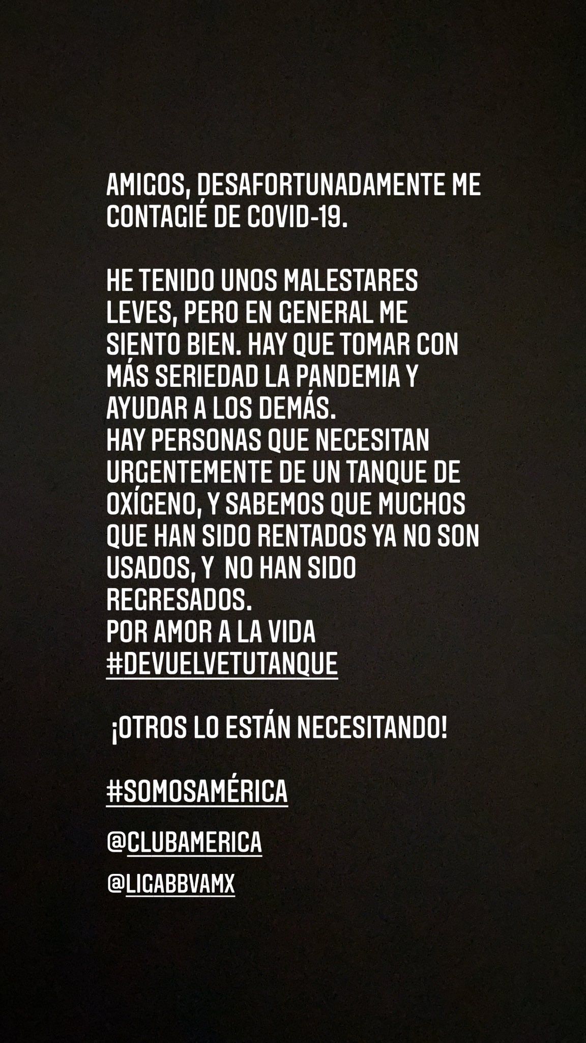 El guardameta desconoció cuándo volverá a la actividad con las Águilas y pidió seguir con las indicaciones de las autoridades para evitar aumento de contagios. "Por favor cuídense, no dejen nada a la deriva, el cubrebocas, lavarse las manos y como dije, devuelvan los tanques de oxígeno, si no los están utilizando. No hay que tomarlo a la ligera, está en nosotros", cerró.