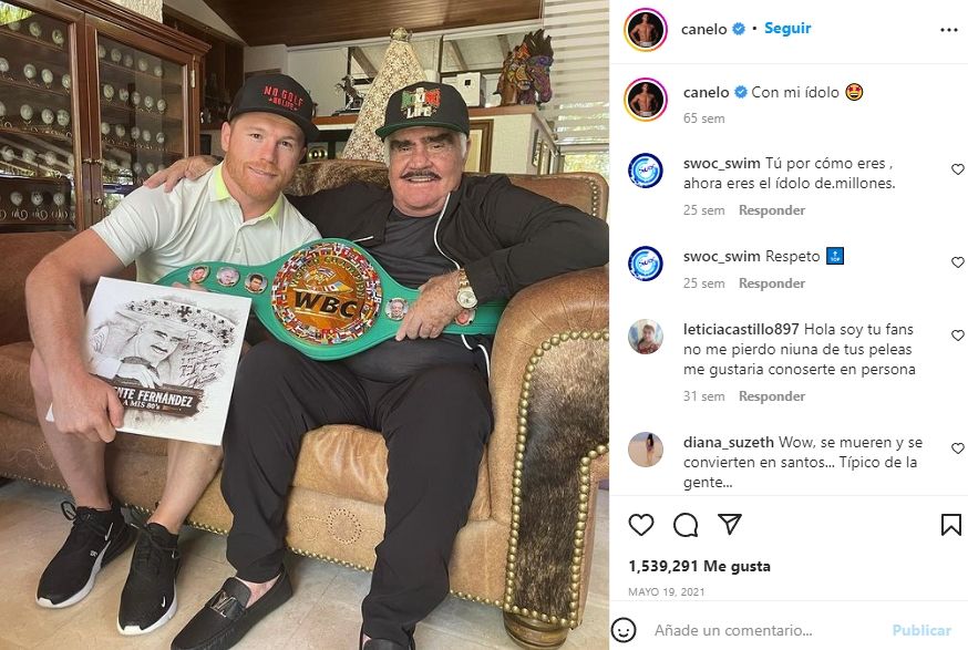 Allí se lo vio al cantante ya fallecido sostener un cinturón del campeón azteca, mientras que por su parte el boxeador tenía en sus manos un disco autografiado por el propio ‘Chente. En esa publicación, Álvarez escribió: "Con mi ídolo".